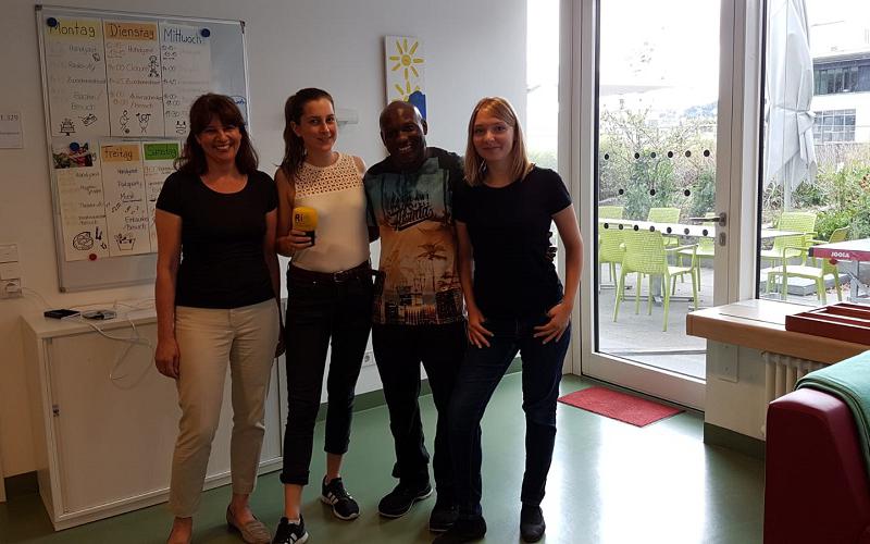 Foto (v.l.) Hina Marquart (Parit. Wohlfahrtsverband), Jasmin Zinßmeister (Radio RiO Moderation), Daniel Denmark, Sandra Schwarzstein (ehrenamtl. Mitarbeiterin Radio RiO)